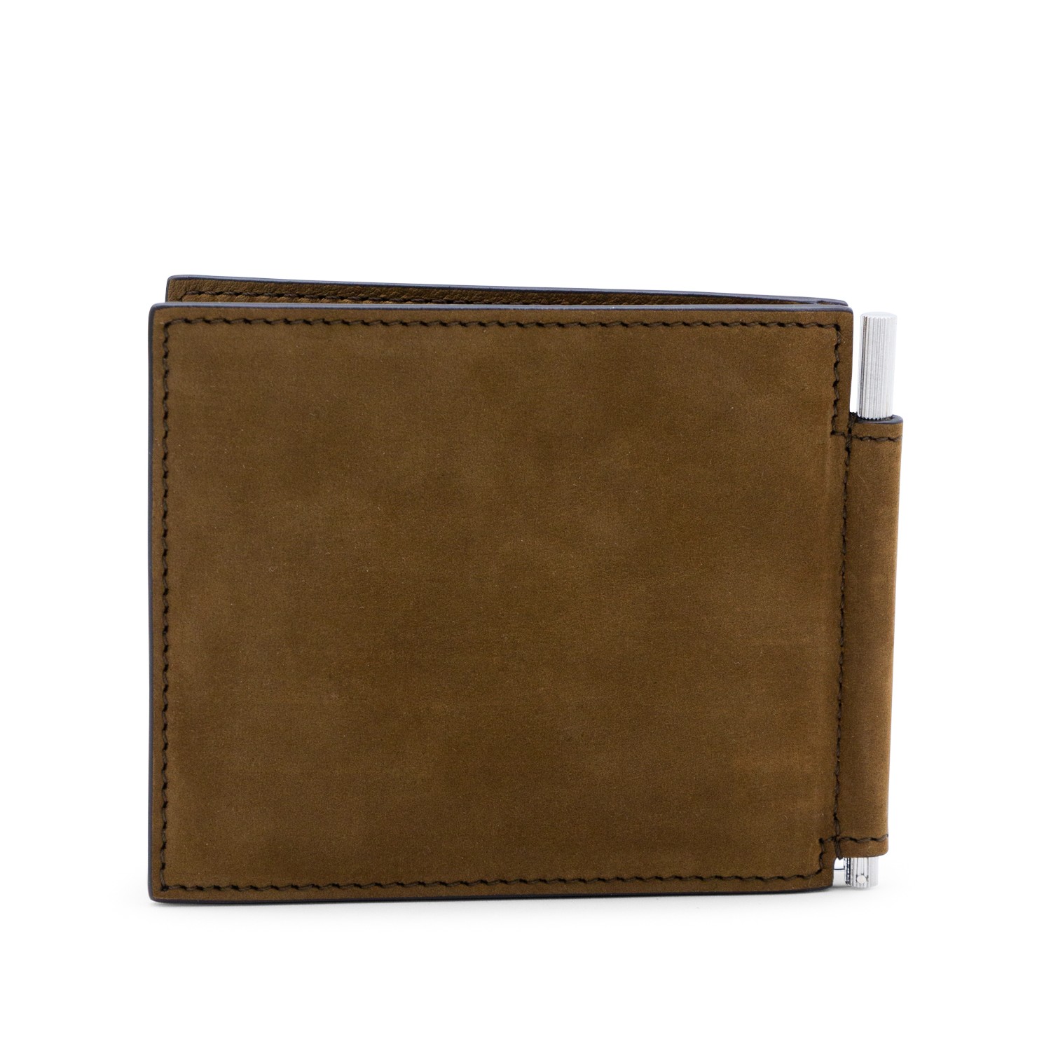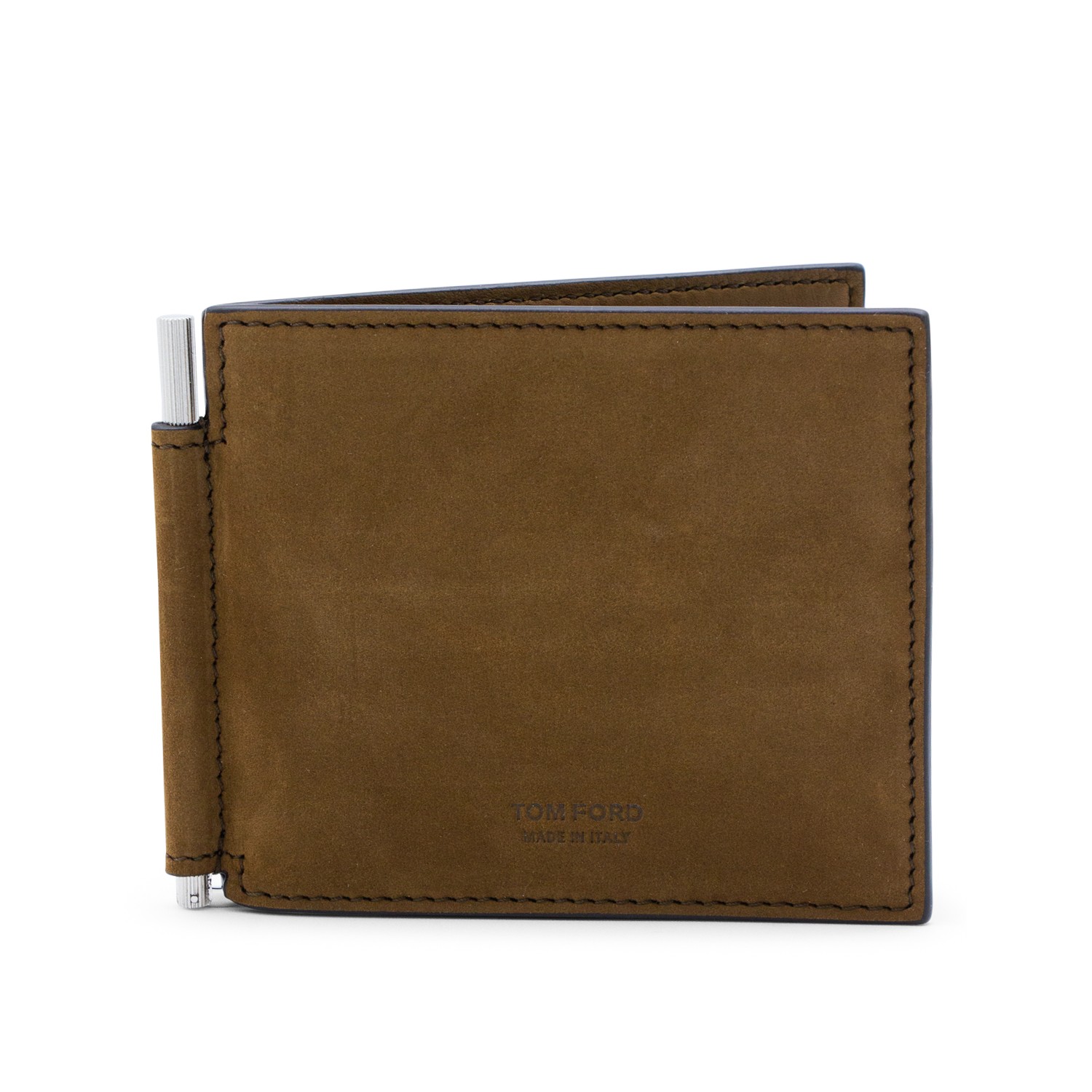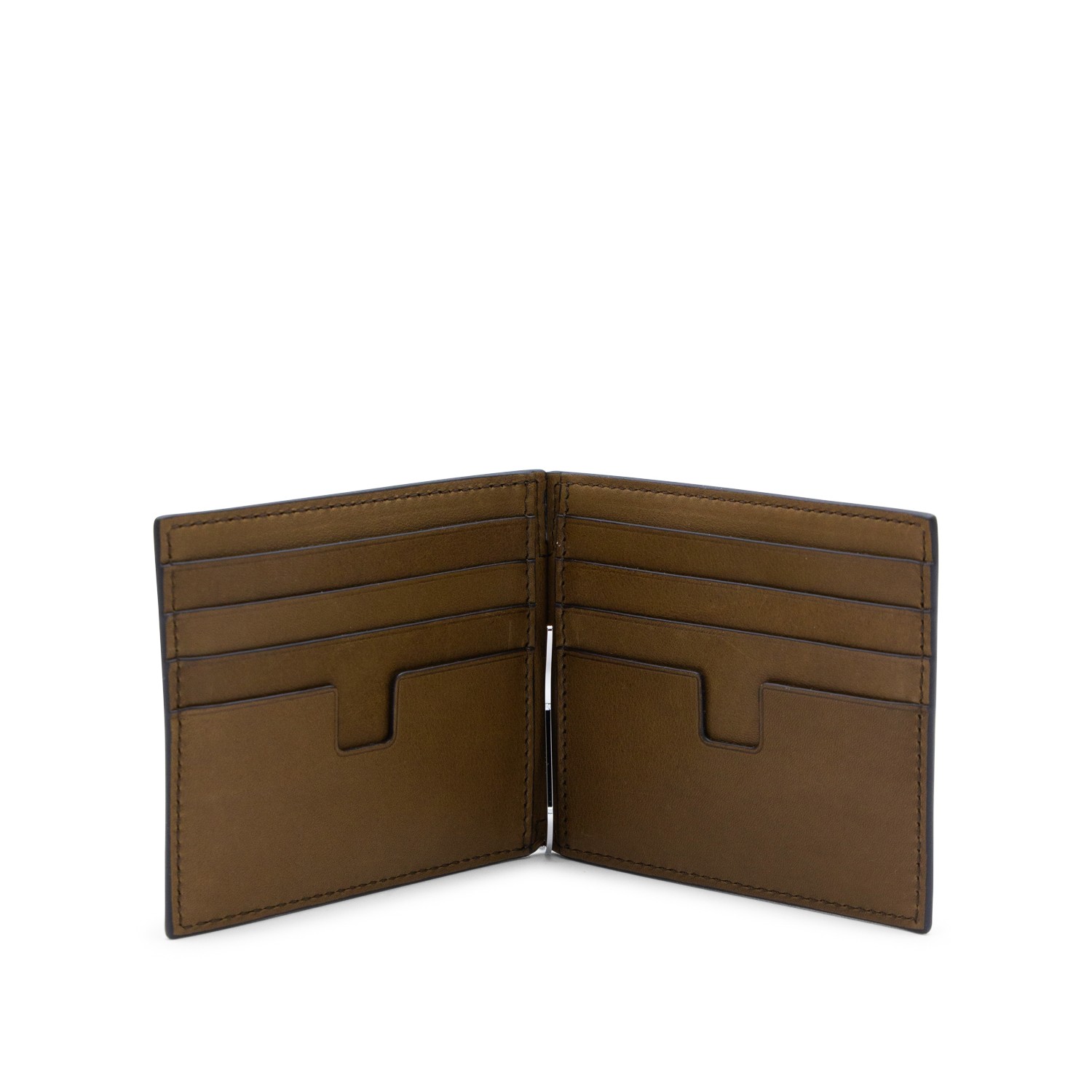 Tobacco leather wallet from Tom Ford featuring frontal logo, cards slot and silver tone hardware.