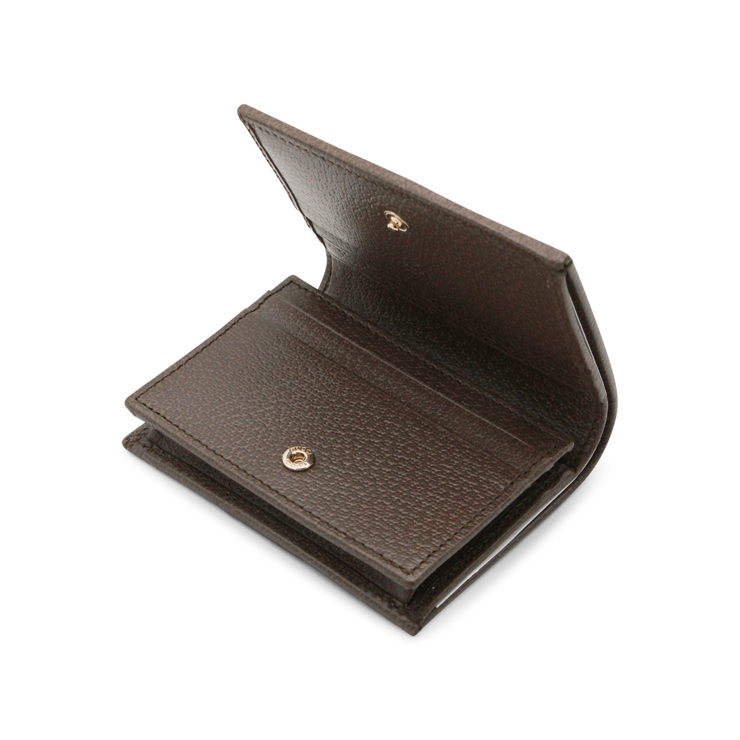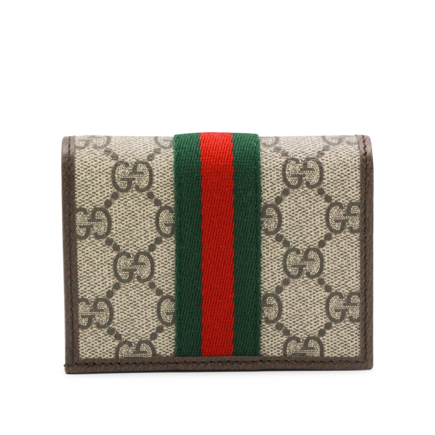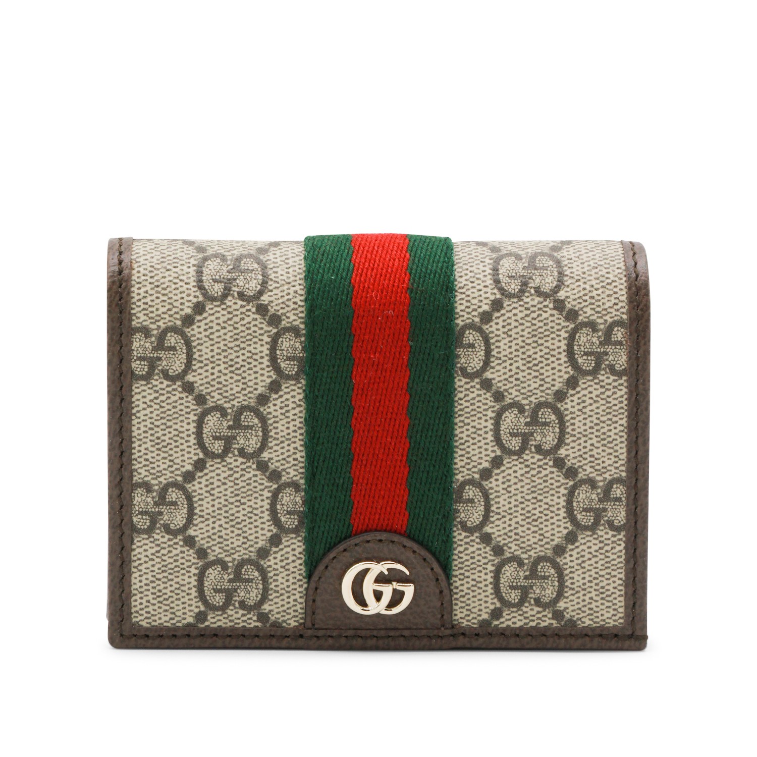 Beige wallet from Gucci featuring GG texture, Web band detail, metal GG logo, snap button closure and card slots.