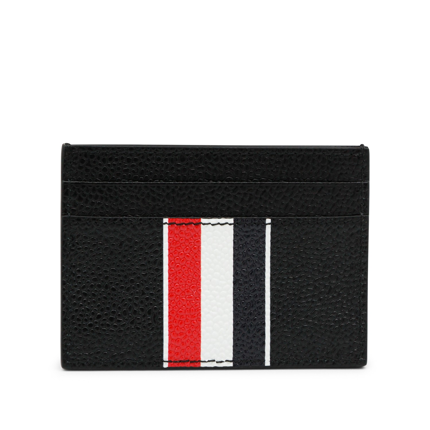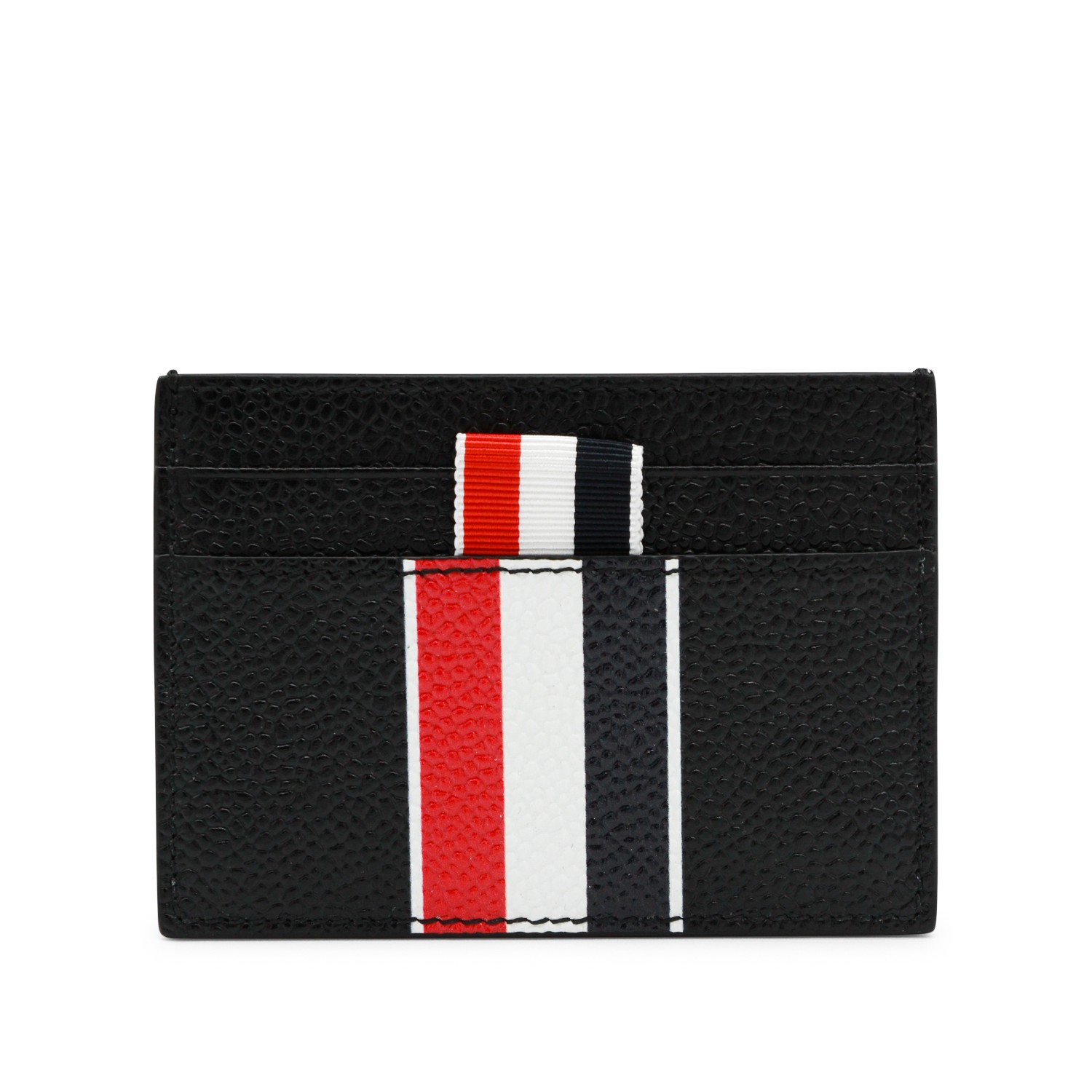 Black card holder from Thom Browne featuring rectangular shape, tricolor Stripe band, logo and card slots.